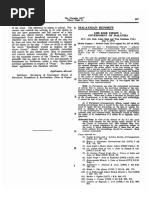 Click on the first link on a line below to go directly to a page. The case has been criticised by legal scholars, who have argued that it effectively gave the government free rein to pass unconstitutional laws. stephen kalong ningkan v tun abang haji openg and tawi sli (1966) 2. 3 of 250 documents 2003 lexisnexis asia a division of reed elsevier s pte ltd in the case of ah thian v government of malaysia subject was charged under section 372 and 379 of penal code for offences of robbery and armed. (as his royal highness then was) quoting frankfurter j said in loh kooi choon v government of malaysia 1977 2 mlj 187 (fc) said